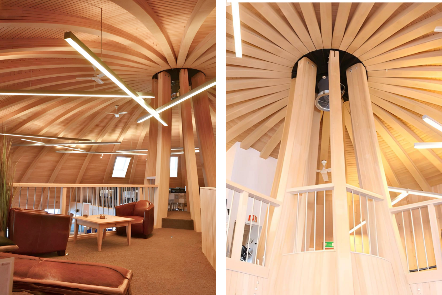 Основным материалом выбрали древесину чёрной ольхи из Белоруссии. Она хорошо проявляет себя в суровых климатических условиях благодаря прочности и влагостойкости. Часть древесины, непригодная для отделки, пошла на производство пеллет, которыми отапливается весь комплекс.